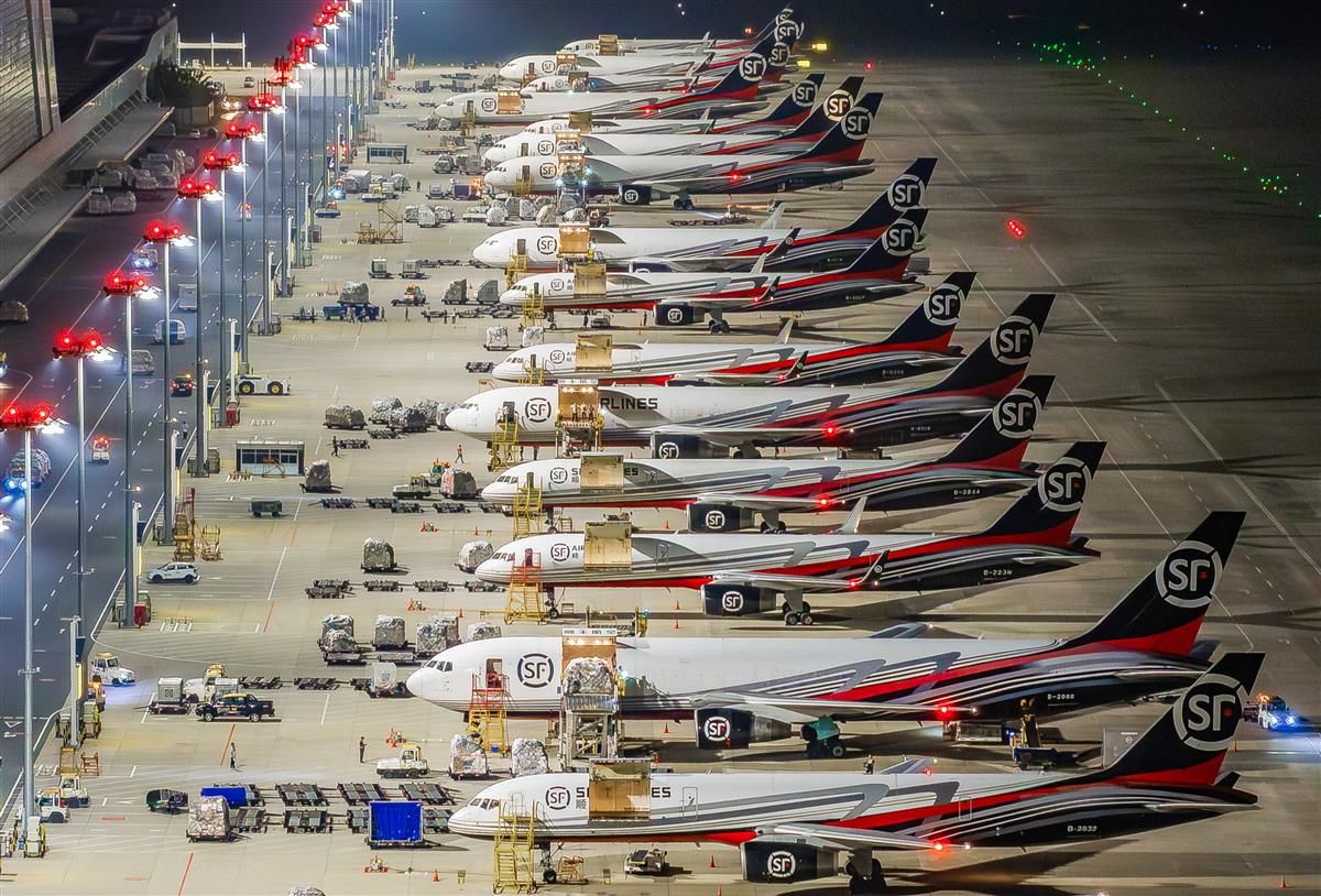 夜幕降临,鄂州花湖国际机场跑道灯火通明,近百架货机起降。